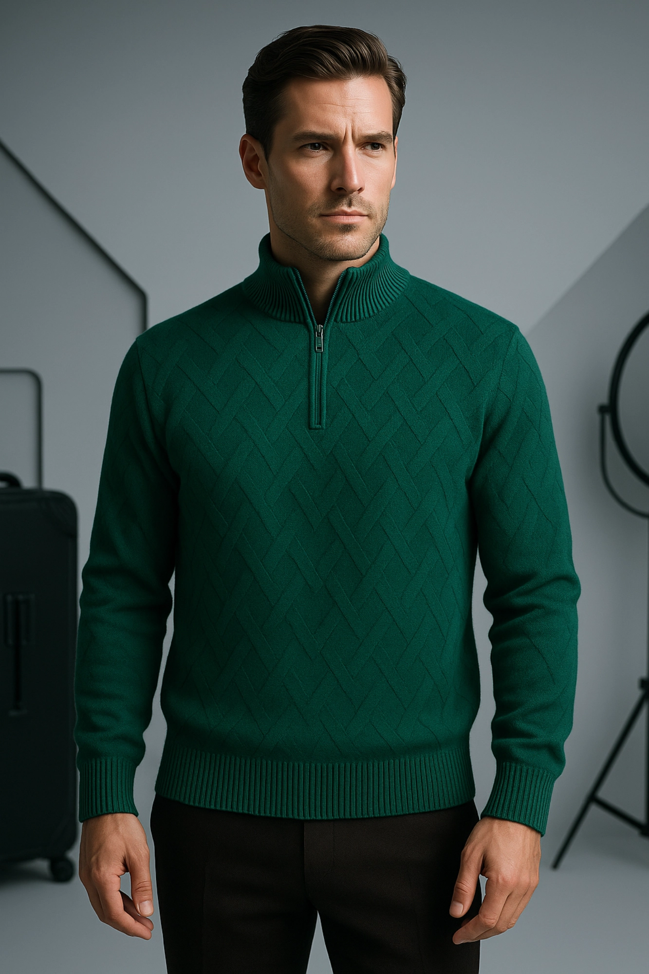 Stand-up collar zipped wicker sweater